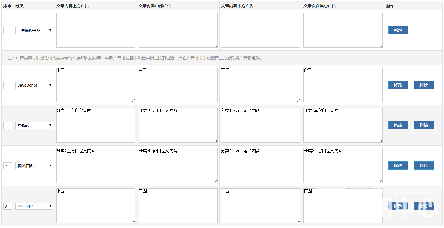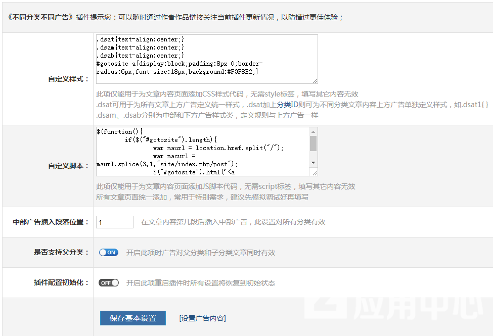 专为不同分类文章添加不同的广告内容/声明信息/各种代码,支持文章内容上、中、下、其它一共4个广告位;