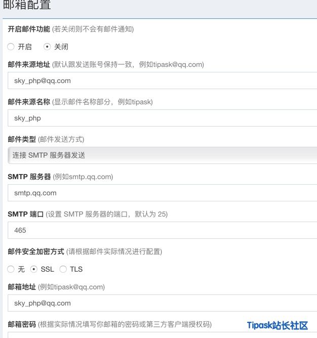 邮件配置,为了不影响tipask3.0的邮箱通知功能,请在后台设置邮箱通知。